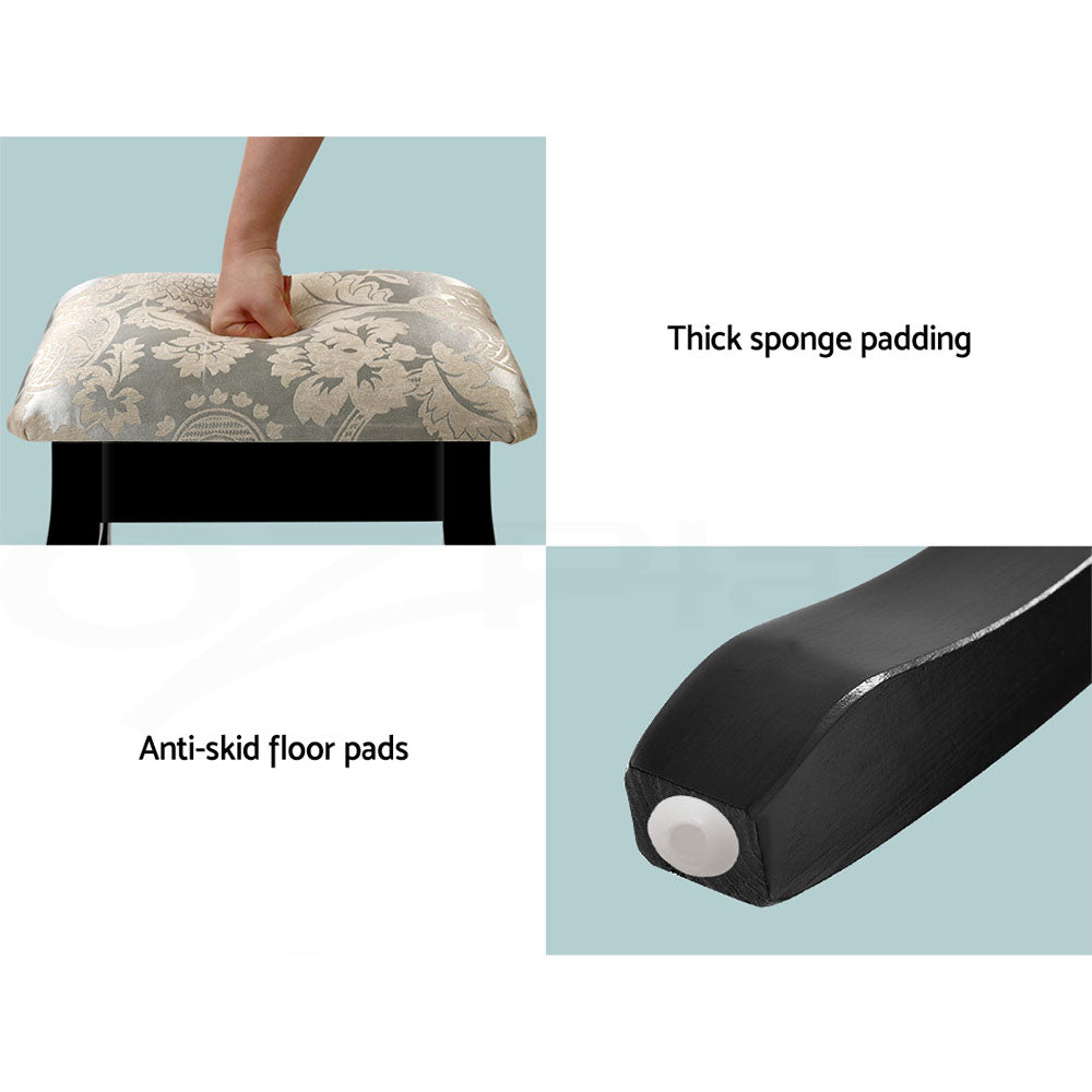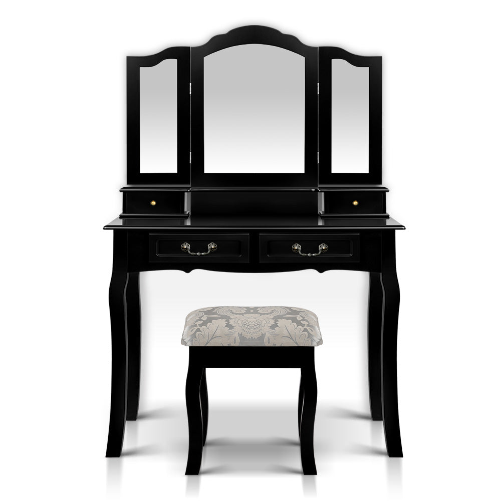 Our provincial-inspired dressing table and stool set is made of hardwood and MDF board and features a swivelling mirror, foldable side mirrors and four detailed drawers with period-stye metal handles. It also has a compensated table design for more seating leg room. The stool is padded and embroidered.
