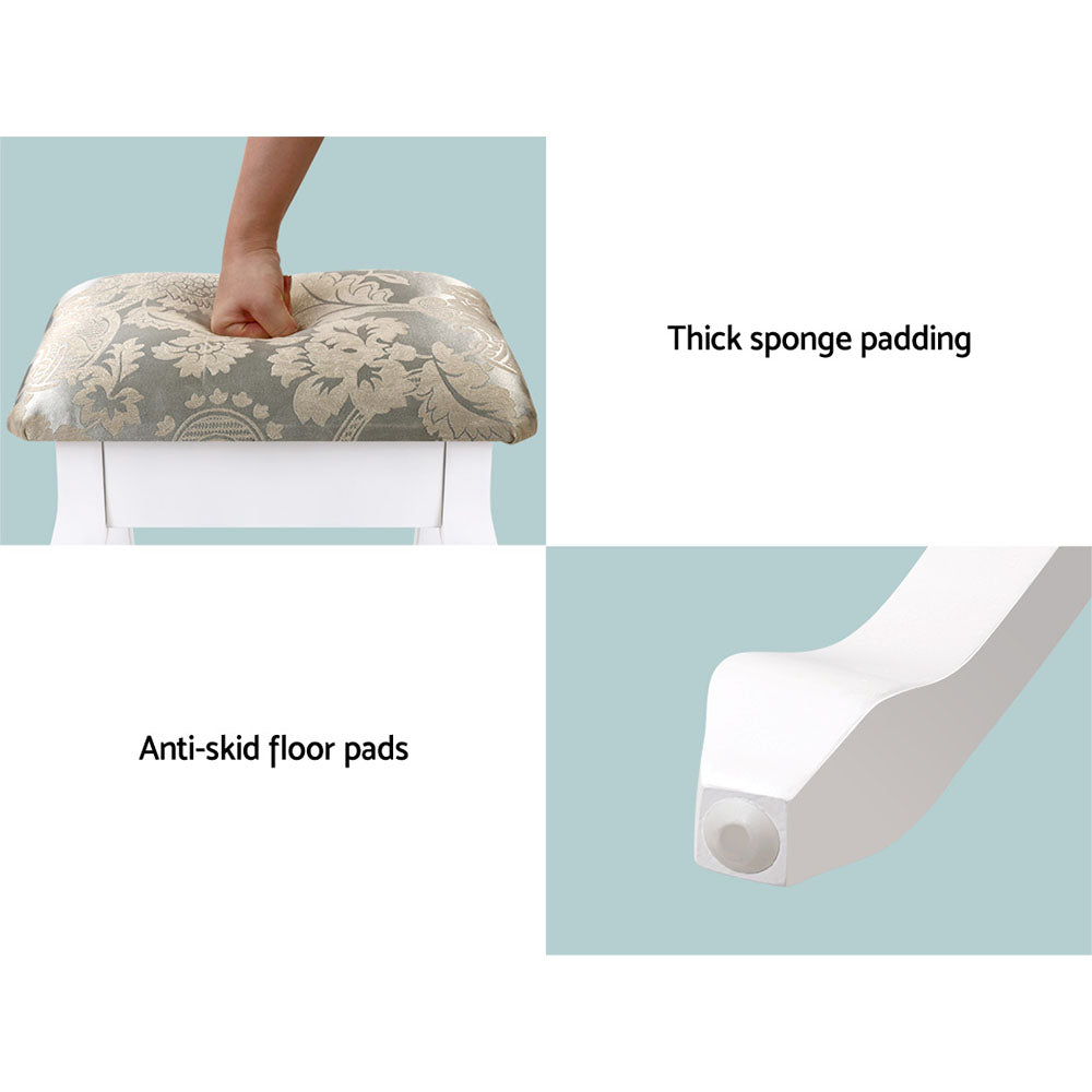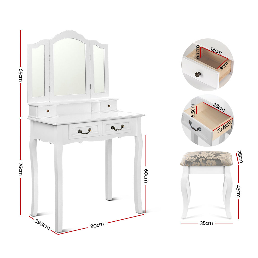 Our provincial-inspired dressing table and stool set is made of hardwood and MDF board and features a swivelling mirror, foldable side mirrors and four detailed drawers with period-stye metal handles. It also has a compensated table design for more seating leg room. The stool is padded and embroidered.